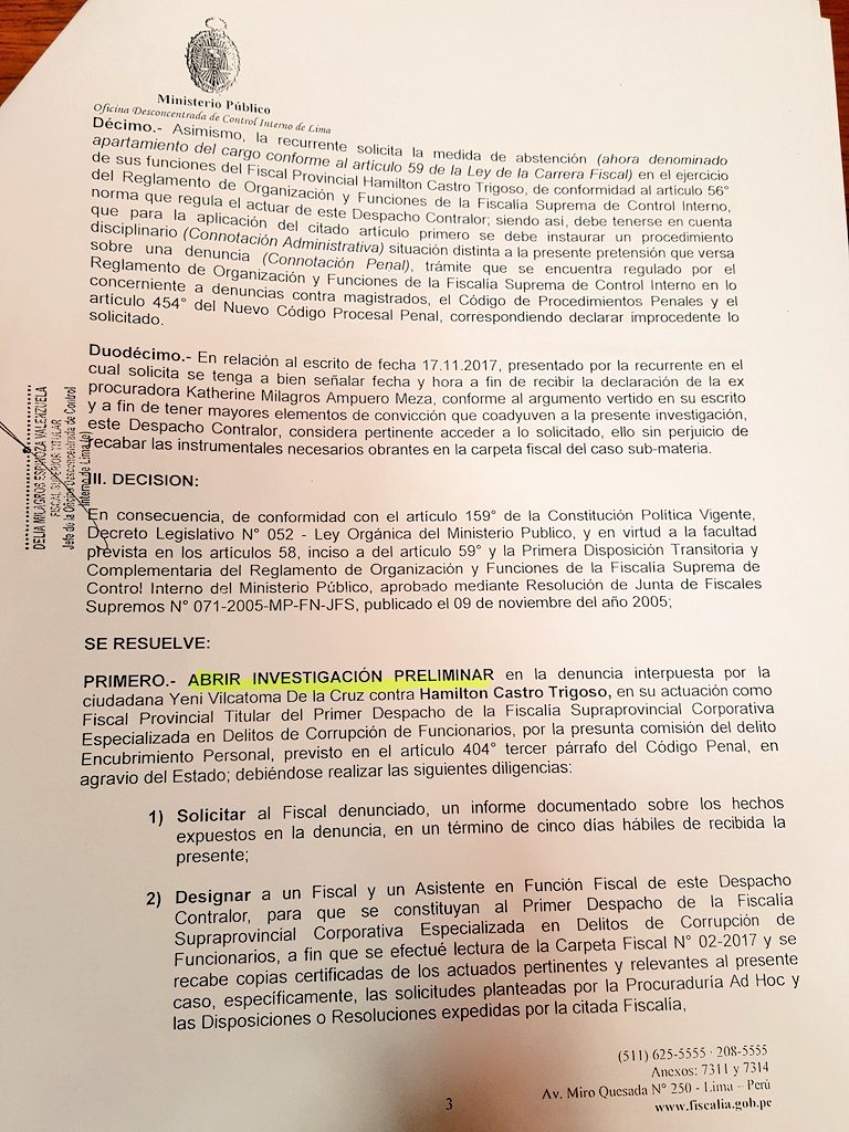 Y es que ayer, el Órgano de Control Interno de la Fiscalía dispuso abrir una investigación preliminar contra Castro Trigoso, por el presunto delito de encubrimiento personal a raíz de una denuncia de la congresista Yeni Vilcatoma, quien lo acusó de no investigar a las empresas peruanas consorciadas con Odebrecht, como Graña y Montero.